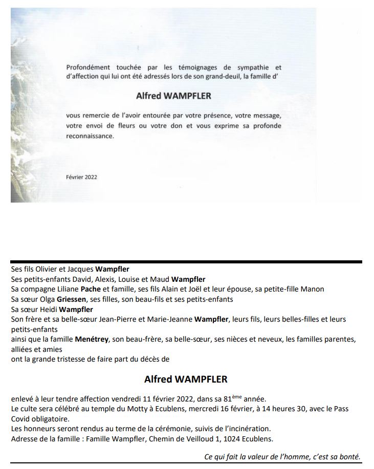Alfred WAMPFLER 25 mar. 1941 - 11 fév. 2022 Avis mortuaire PFG Télecharger PDF Partager sur: Galerie PreviousNext PreviousNext