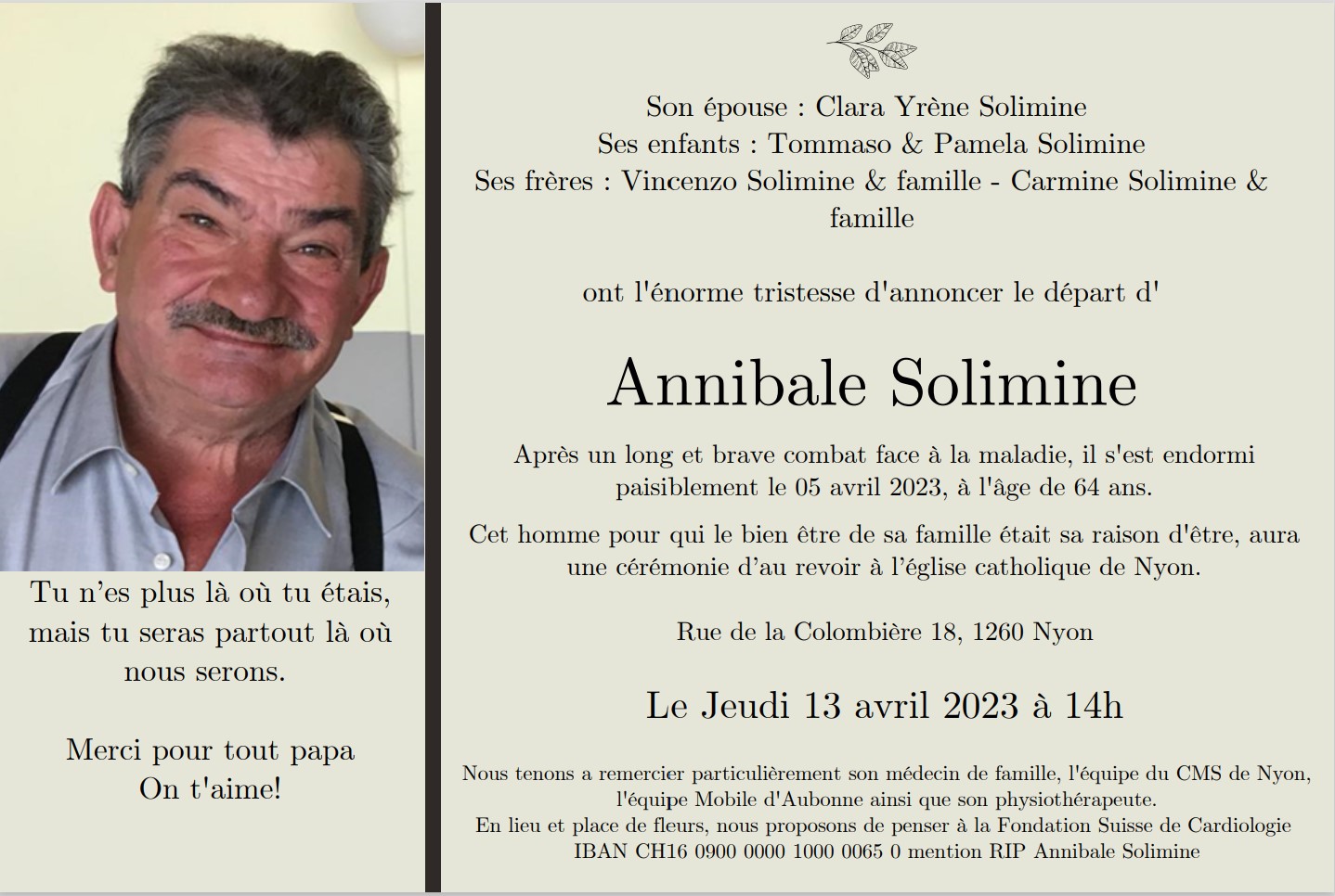 Annibale Solimine 25 sep. 1958 - 05 avr. 2023 Avis mortuaire PFG Télecharger PDF Partager sur: Galerie PreviousNext PreviousNext