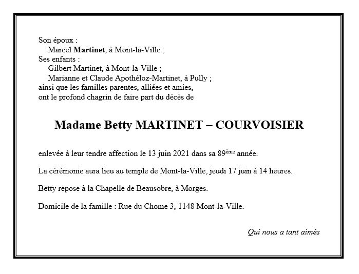 Betty MARTINET 29 juil. 1932 - 13 juin. 2021 Avis mortuaire PFG Télecharger PDF Partager sur: Galerie PreviousNext PreviousNext