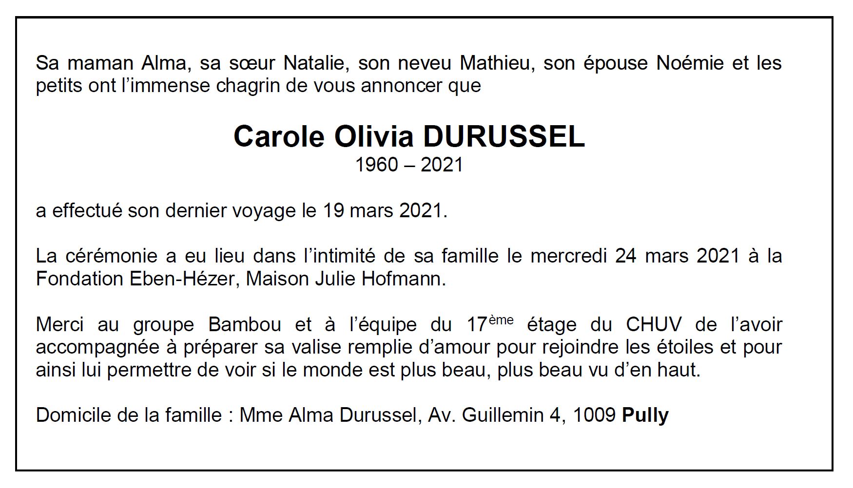 Carole DURUSSEL 24 mar. 2021 Avis mortuaire PFG Télecharger PDF Partager sur: Galerie PreviousNext PreviousNext