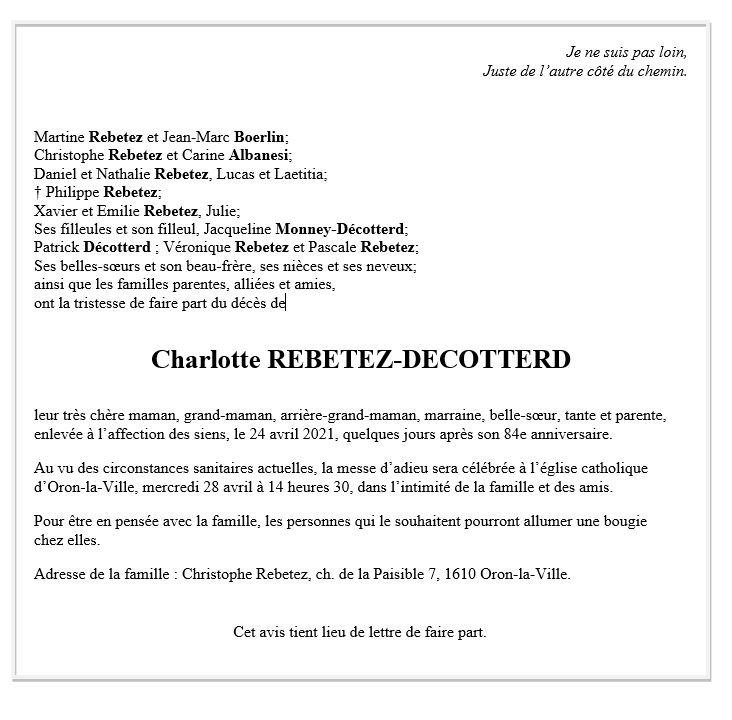 Charlotte REBETEZ-DECOTTERD 15 avr. 1937 - 24 avr. 2021 Avis mortuaire PFG Télecharger PDF Partager sur: Galerie PreviousNext PreviousNext