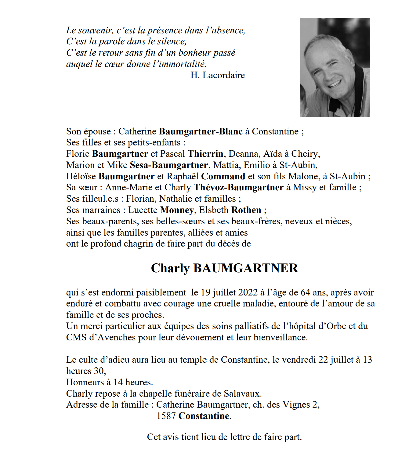 Charly BAUMGARTNER 16 juil. 1958 - 19 juil. 2022 Avis mortuaire PFG Télecharger PDF Partager sur: Galerie