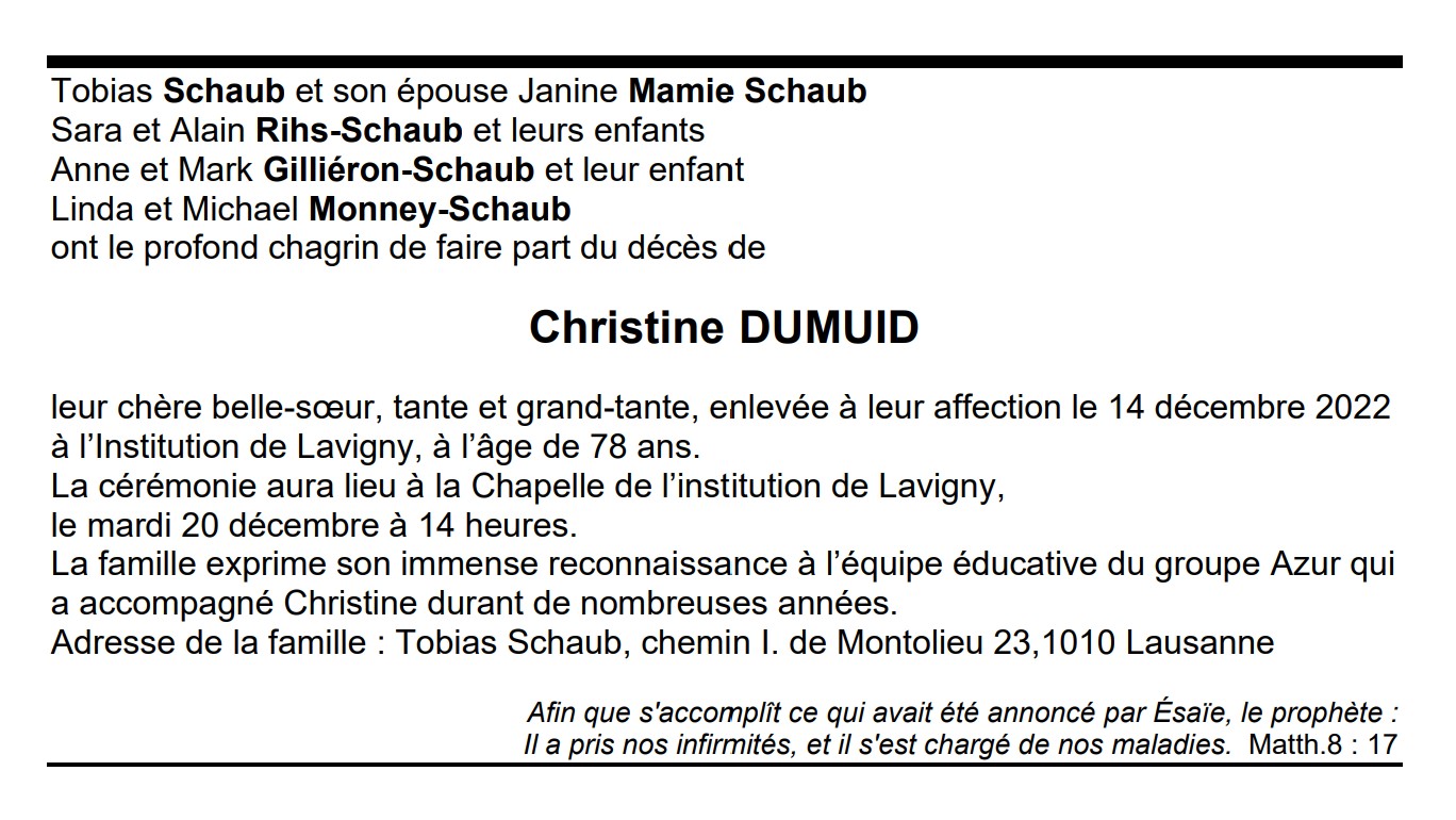 Christine DUMUID 12 déc. 1944 - 14 déc. 2022 Avis mortuaire PFG Télecharger PDF Partager sur: Galerie PreviousNext PreviousNext