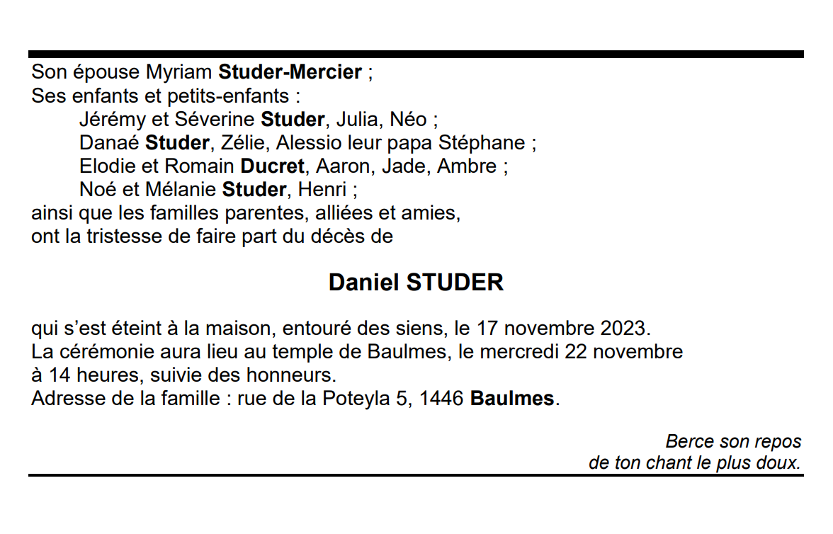 Daniel STUDER 11 jan. 1952 - 17 nov. 2023 Avis mortuaire PFG Télecharger PDF Partager sur: Galerie PreviousNext PreviousNext
