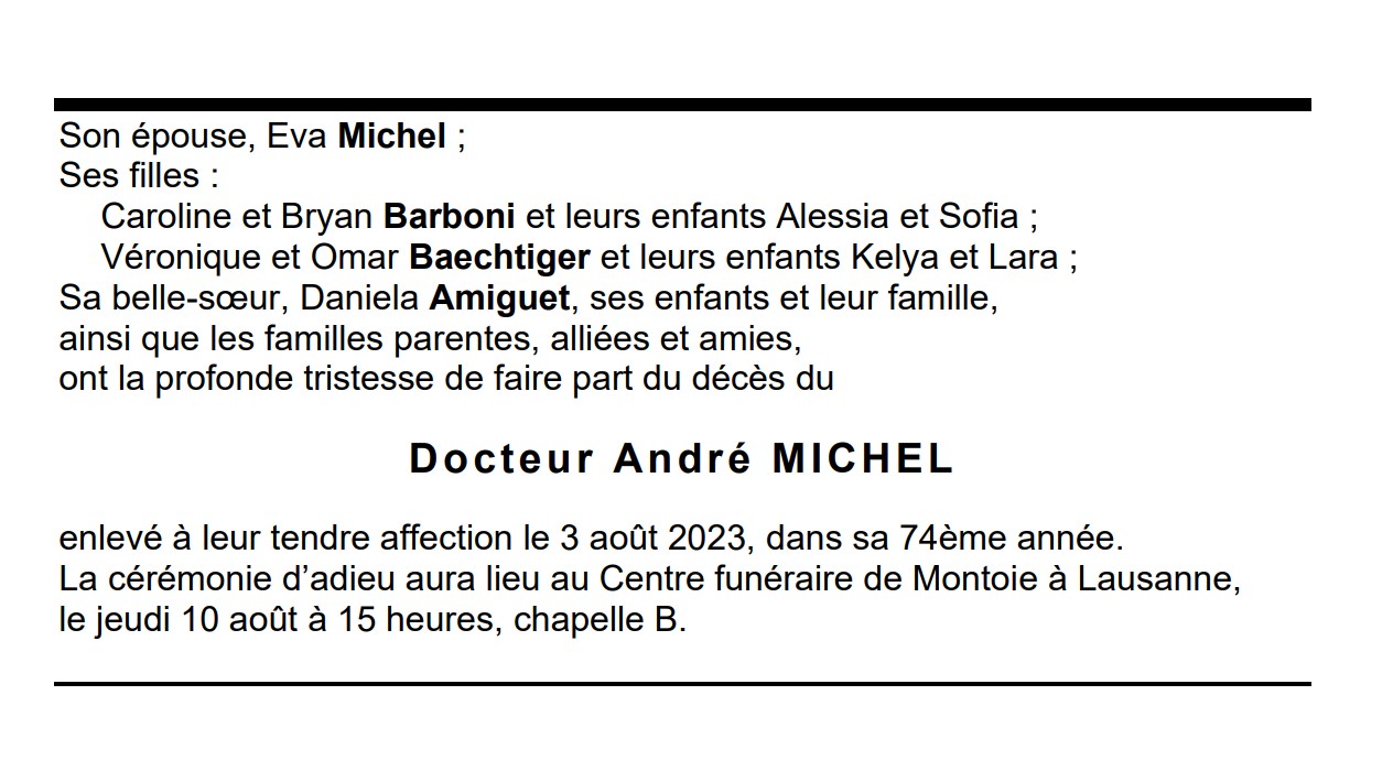 Docteur André MICHEL 22 jan. 1949 - 03 aoû. 2023 Avis mortuaire PFG Télecharger PDF Partager sur: Galerie PreviousNext PreviousNext