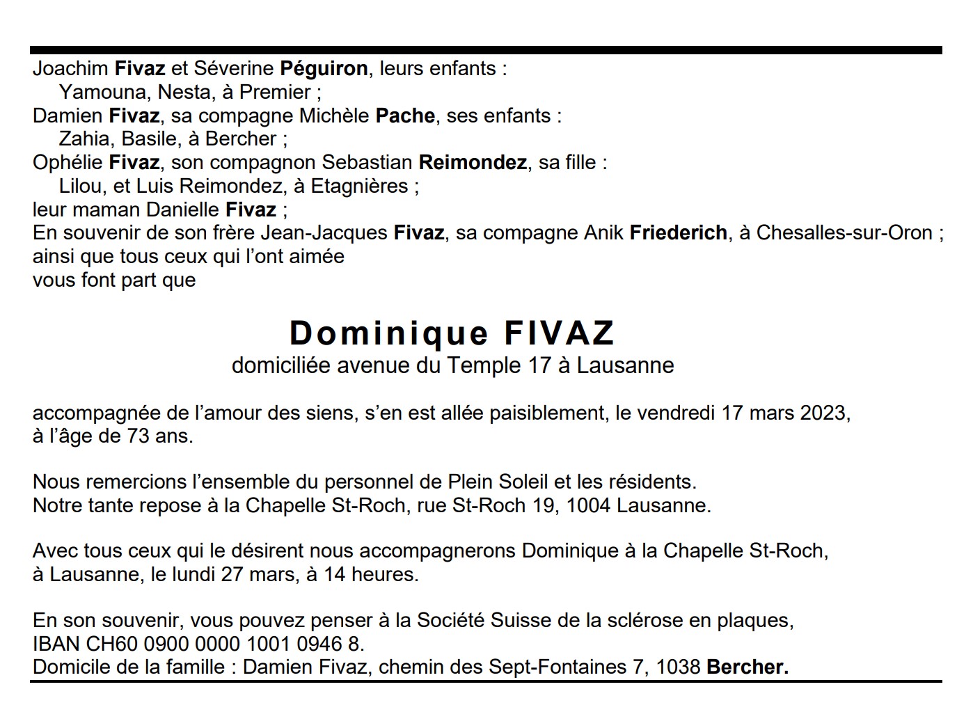 Dominique FIVAZ 01 jan. 1950 - 17 mar. 2023 Avis mortuaire PFG Télecharger PDF Partager sur: Galerie PreviousNext PreviousNext