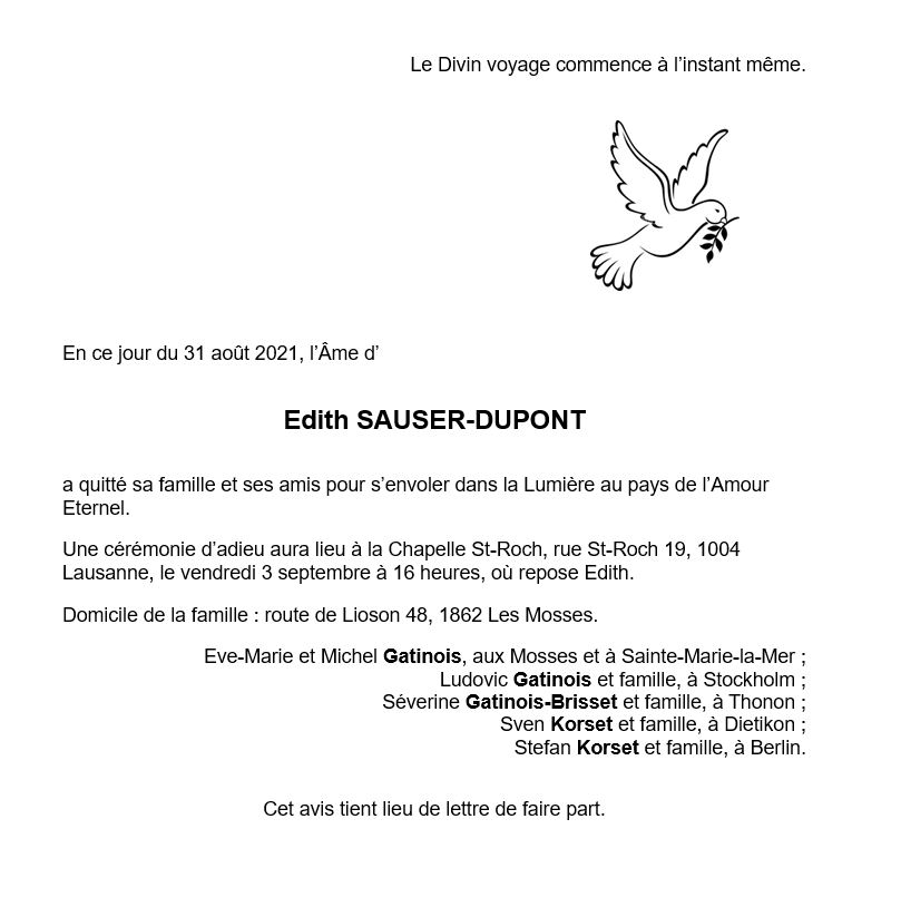 Edith SAUSER-DUPONT 10 fév. 1922 - 31 aoû. 2021 Avis mortuaire PFG Télecharger PDF Partager sur: Galerie PreviousNext PreviousNext