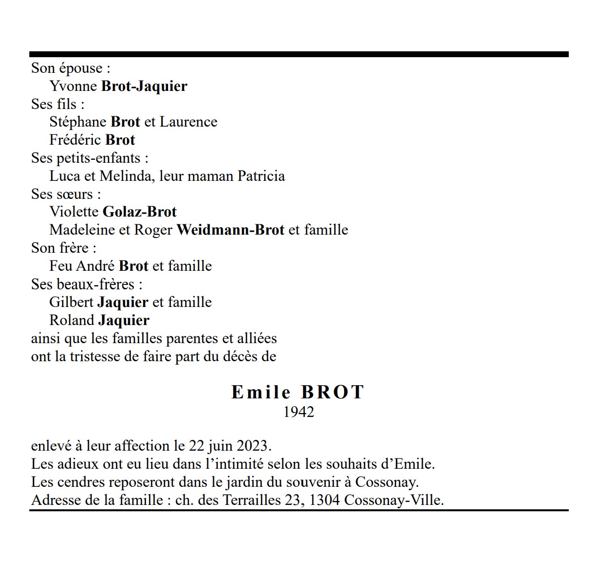 Emile BROT 08 juin. 1942 - 22 juin. 2023 Avis mortuaire PFG Télecharger PDF Partager sur: Galerie PreviousNext PreviousNext