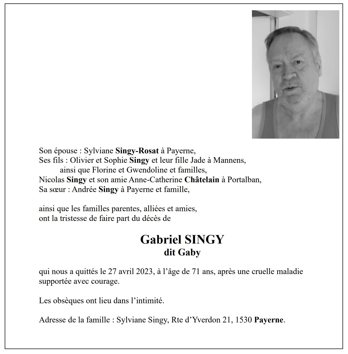 Gabriel SINGY dit Gaby 16 avr. 1952 - 27 avr. 2023 Avis mortuaire PFG Télecharger PDF Partager sur: Galerie