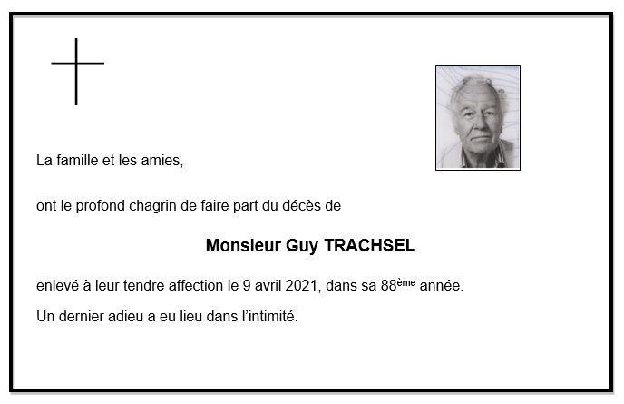 Guy TRACHSEL 06 aoû. 1933 - 09 avr. 2021 Avis mortuaire PFG Télecharger PDF Partager sur: Galerie PreviousNext PreviousNext