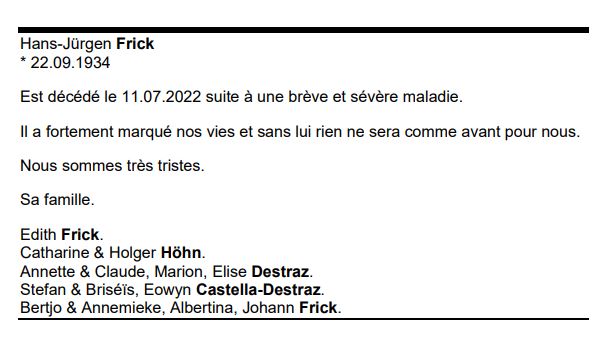 Hans-Jürgen Frick 22 sep. 1934 - 11 juil. 2022 Avis mortuaire PFG Télecharger PDF Partager sur: Galerie PreviousNext PreviousNext