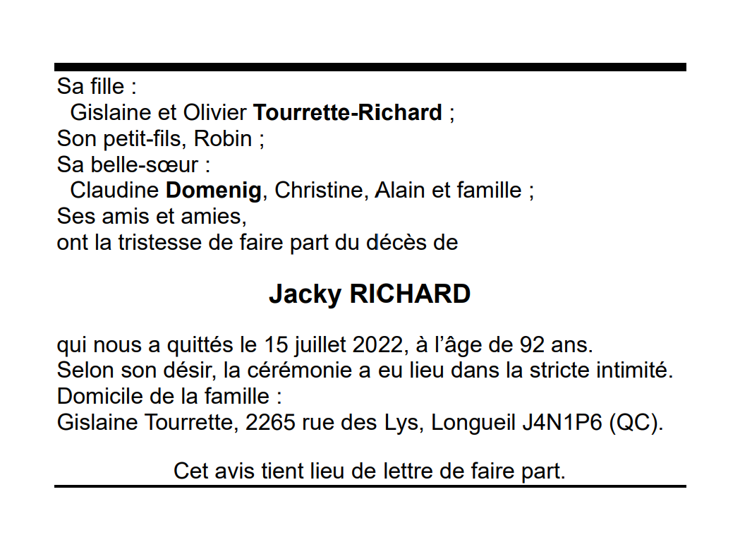 Jacky RICHARD 24 sep. 1929 - 15 juil. 2022 Avis mortuaire PFG Télecharger PDF Partager sur: Galerie PreviousNext PreviousNext