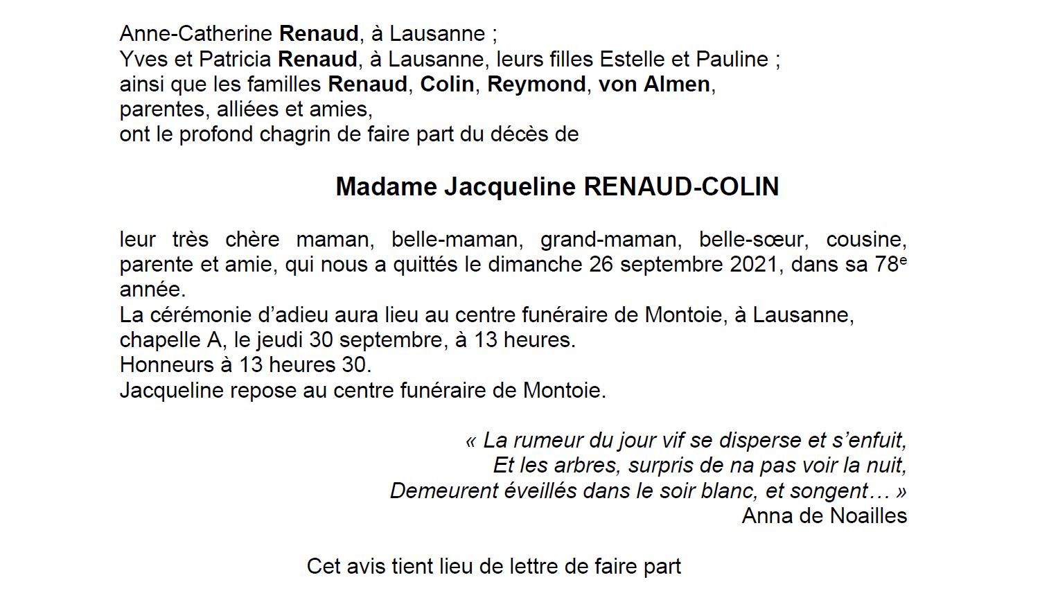Jacqueline Renaud 30 oct. 1943 - 26 sep. 2021 Avis mortuaire PFG Télecharger PDF Partager sur: Galerie PreviousNext PreviousNext