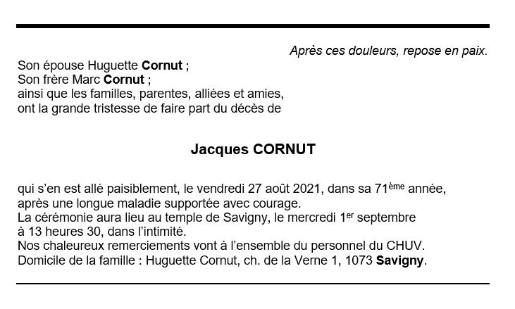 Jacques CORNUT 12 déc. 1950 - 27 aoû. 2021 Avis mortuaire PFG Télecharger PDF Partager sur: Galerie PreviousNext PreviousNext