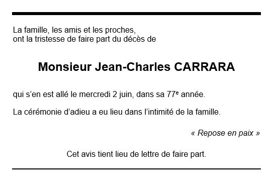 Jean-Charles CARRARA 04 oct. 1944 - 02 juin. 2021 Avis mortuaire PFG Télecharger PDF Partager sur: Galerie PreviousNext PreviousNext