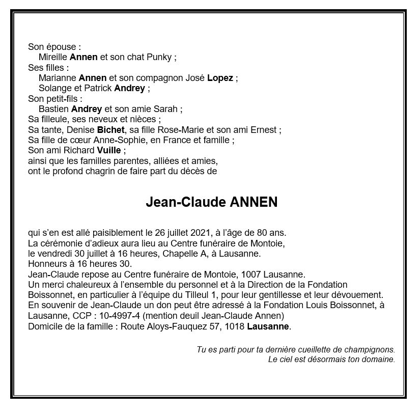 Jean-Claude ANNEN 26 fév. 1941 - 26 juil. 2021 Avis mortuaire PFG Télecharger PDF Partager sur: Galerie PreviousNext PreviousNext