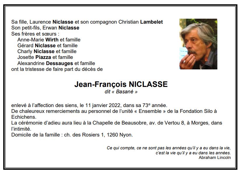 Jean-François NICLASSE 11 juin. 1949 - 11 jan. 2022 Avis mortuaire PFG Télecharger PDF Partager sur: Galerie PreviousNext PreviousNext