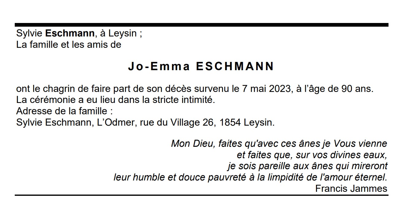 Jo-Emma ESCHMANN 25 fév. 1933 - 07 mai. 2023 Avis mortuaire PFG Télecharger PDF Partager sur: Galerie PreviousNext PreviousNext