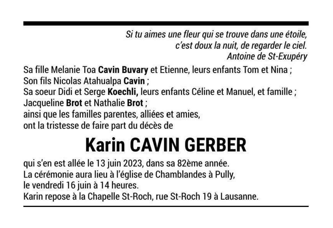 Karin CAVIN GERBER 26 nov. 1941 - 13 juin. 2023 Avis mortuaire PFG Télecharger PDF Partager sur: Galerie PreviousNext PreviousNext