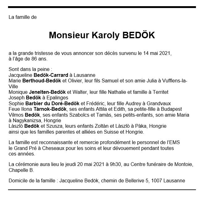 Karoly BEDÖK 25 avr. 1935 - 14 mai. 2021 Avis mortuaire PFG Télecharger PDF Partager sur: Galerie PreviousNext PreviousNext