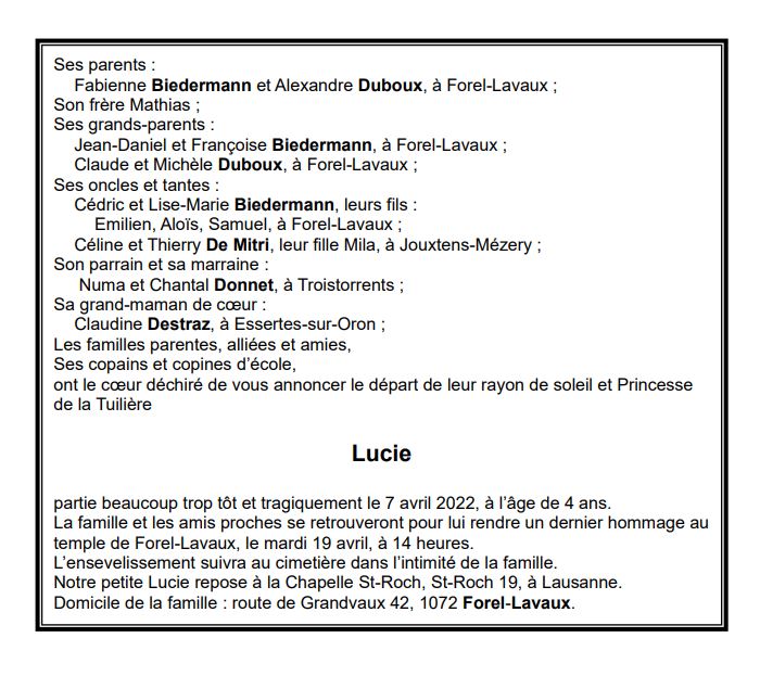 Lucie 18 juin. 2017 - 07 avr. 2022 Avis mortuaire PFG Télecharger PDF Partager sur: Galerie PreviousNext PreviousNext