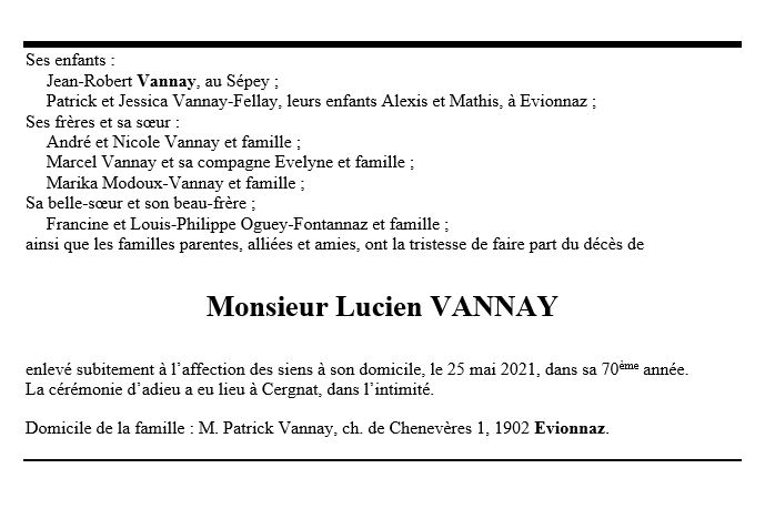 Lucien VANNAY 03 aoû. 1951 - 25 mai. 2021 Avis mortuaire PFG Télecharger PDF Partager sur: Galerie PreviousNext PreviousNext