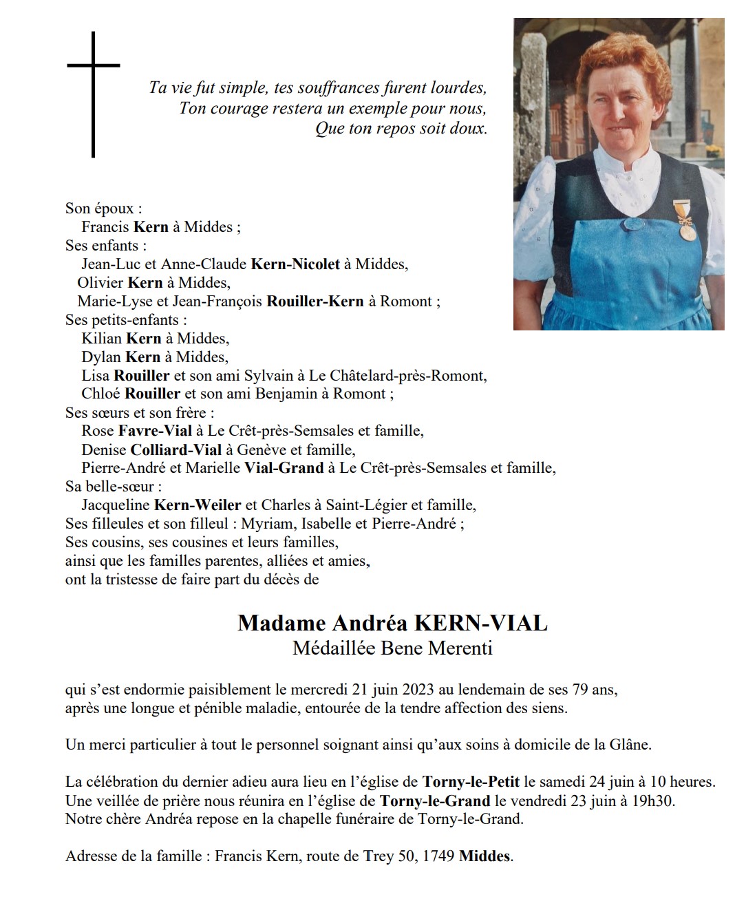 Madame Andréa KERN-VIAL Médaillée Bene Merenti 11 mai. 1944 - 21 juin. 2023 Avis mortuaire PFG Télecharger PDF Partager sur: Galerie
