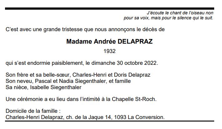 Madame Andrée DELAPRAZ 01 juin. 1932 - 30 oct. 2022 Avis mortuaire PFG Télecharger PDF Partager sur: Galerie PreviousNext PreviousNext