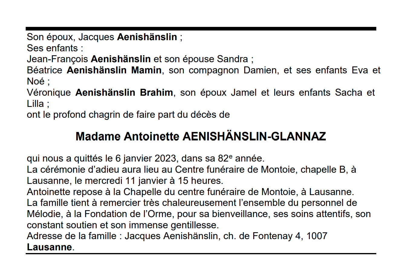 Madame Antoinette AENISHÄNSLIN-GLANNAZ 13 avr. 1940 - 06 jan. 2023 Avis mortuaire PFG Télecharger PDF Partager sur: Galerie PreviousNext PreviousNext