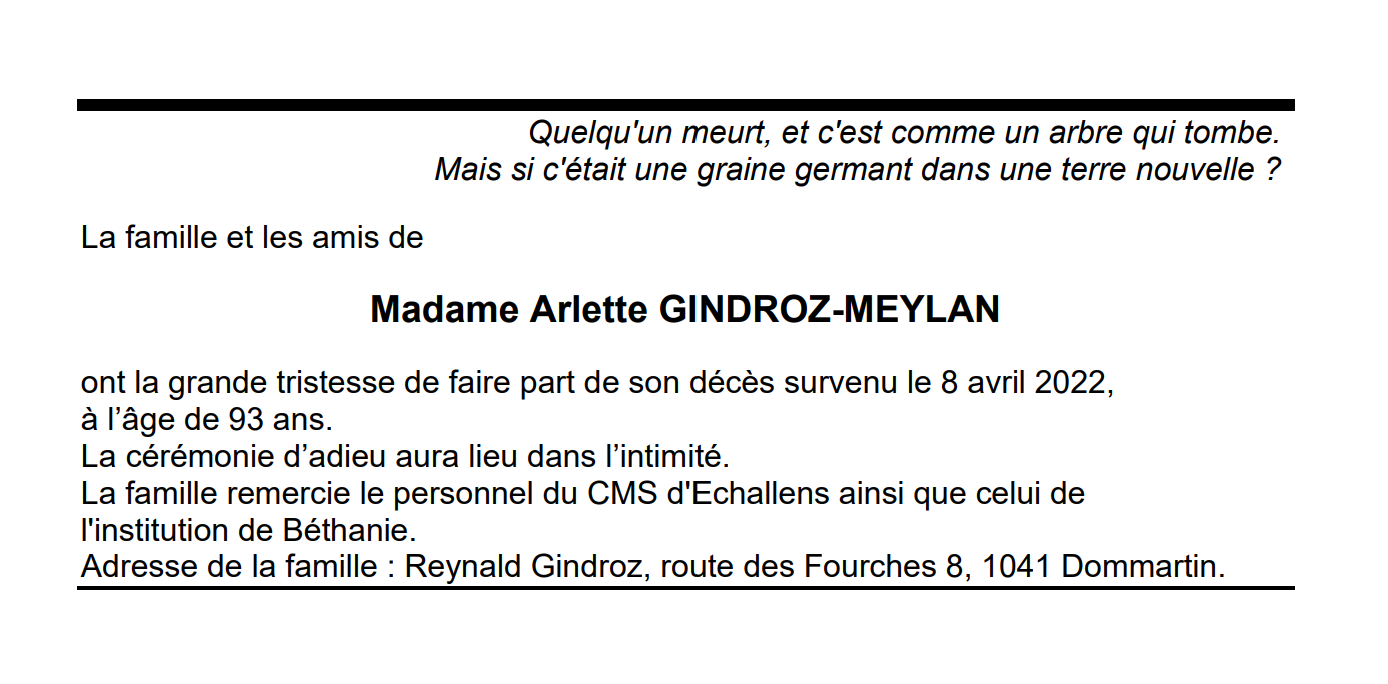 Madame Arlette GINDROZ-MEYLAN 24 avr. 1929 - 08 avr. 2022 Avis mortuaire PFG Télecharger PDF Partager sur: Galerie PreviousNext PreviousNext