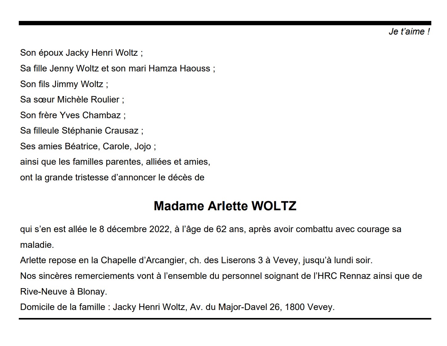 Madame Arlette WOLTZ 08 fév. 1960 - 08 déc. 2022 Avis mortuaire PFG Télecharger PDF Partager sur: Galerie PreviousNext PreviousNext