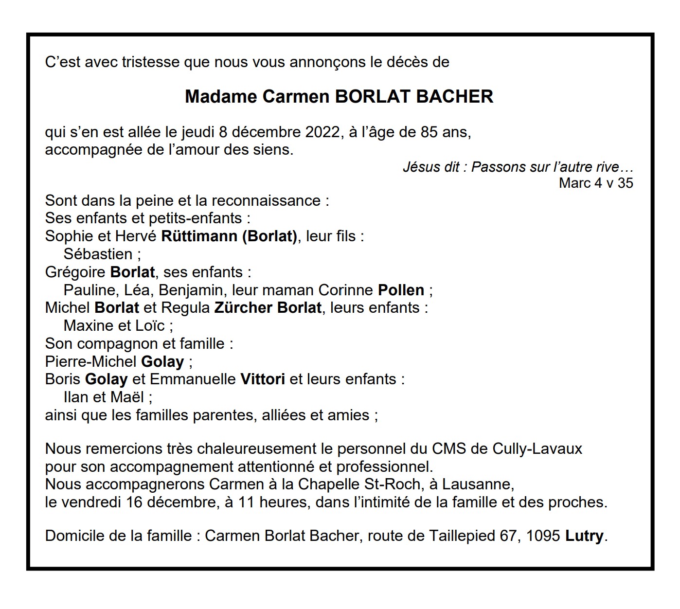 Madame Carmen BORLAT BACHER 28 mai. 1937 - 08 déc. 2022 Avis mortuaire PFG Télecharger PDF Partager sur: Galerie PreviousNext PreviousNext