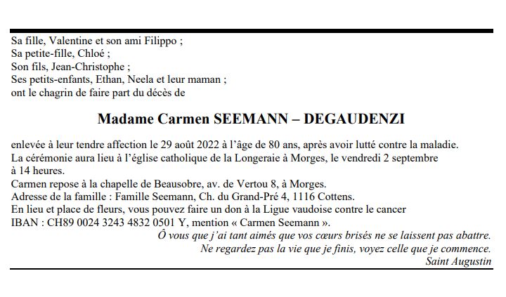 Madame Carmen SEEMANN – DEGAUDENZI 23 fév. 1942 - 29 aoû. 2022 Avis mortuaire PFG Télecharger PDF Partager sur: Galerie PreviousNext PreviousNext