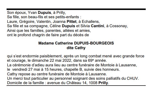 Madame Catherine DUPUIS-BOURGEOIS 11 déc. 1953 - 22 mai. 2022 Avis mortuaire PFG Télecharger PDF Partager sur: Galerie PreviousNext PreviousNext