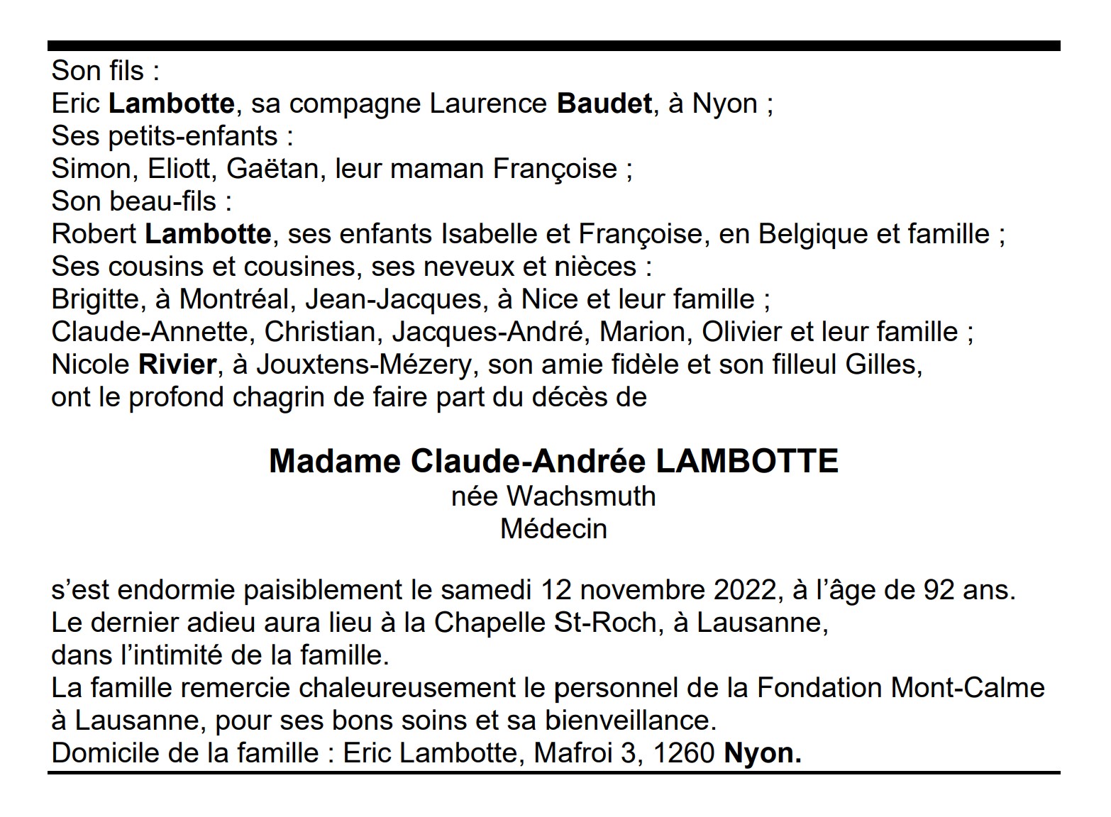 Madame Claude-Andrée LAMBOTTE 04 sep. 1930 - 12 nov. 2022 Avis mortuaire PFG Télecharger PDF Partager sur: Galerie PreviousNext PreviousNext