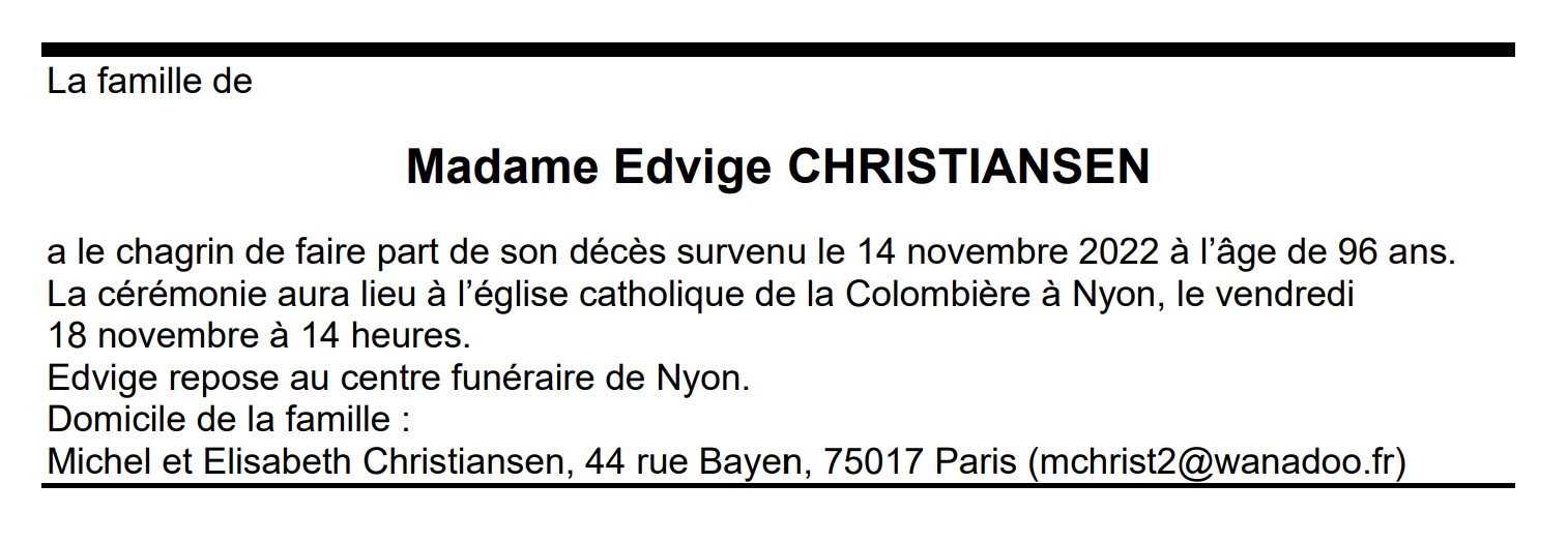 Madame Edvige CHRISTIANSEN 19 juil. 1926 - 14 nov. 2022 Avis mortuaire PFG Télecharger PDF Partager sur: Galerie PreviousNext PreviousNext