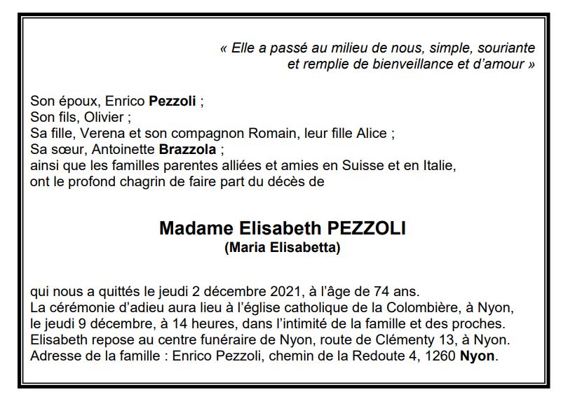 Madame Elisabeth PEZZOLI 25 oct. 1947 - 02 déc. 2021 Avis mortuaire PFG Télecharger PDF Partager sur: Galerie PreviousNext PreviousNext