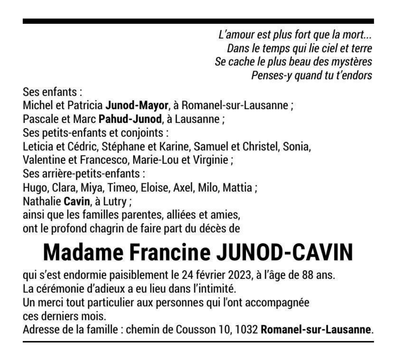 Madame Francine JUNOD-CAVIN 20 jan. 1935 - 24 fév. 2023 Avis mortuaire PFG Télecharger PDF Partager sur: Galerie PreviousNext PreviousNext