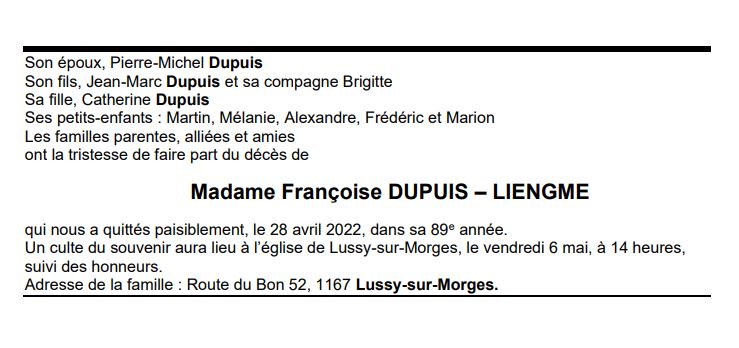 Madame Françoise DUPUIS – LIENGME 20 sep. 1933 - 28 avr. 2022 Avis mortuaire PFG Télecharger PDF Partager sur: Galerie PreviousNext PreviousNext