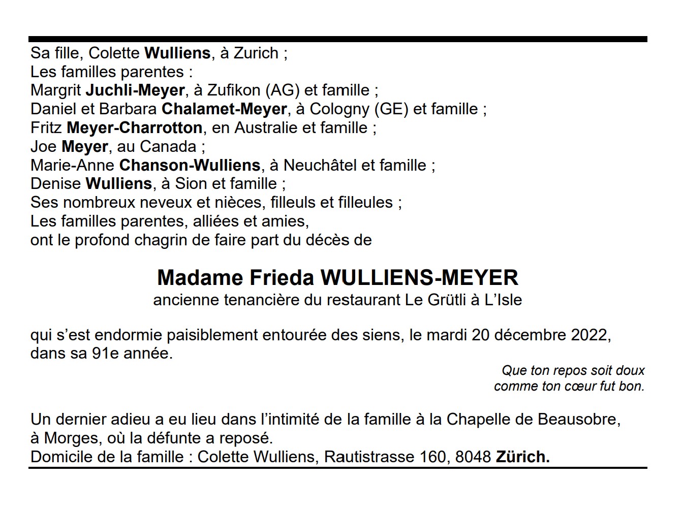 Madame Frieda WULLIENS-MEYER 24 fév. 1932 - 20 déc. 2022 Avis mortuaire PFG Télecharger PDF Partager sur: Galerie PreviousNext PreviousNext