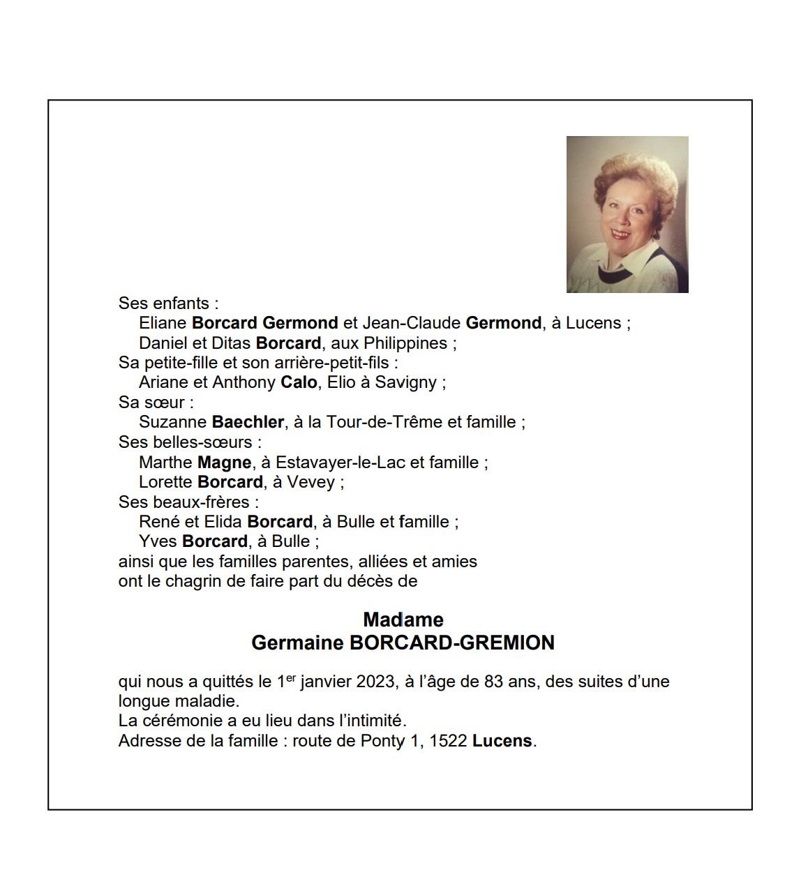 Madame Germaine BORCARD-GREMION 30 nov. 1939 - 01 jan. 2023 Avis mortuaire PFG Télecharger PDF Partager sur: Galerie PreviousNext PreviousNext