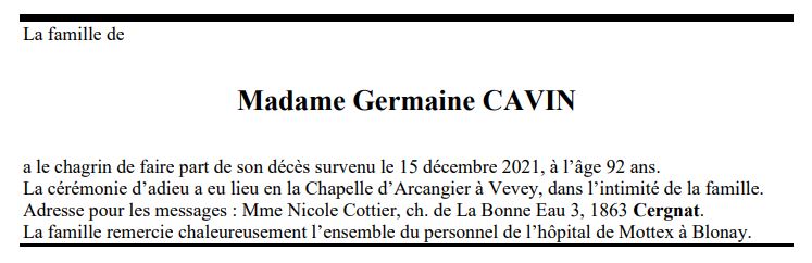 Madame Germaine CAVIN 18 nov. 1929 - 15 déc. 2021 Avis mortuaire PFG Télecharger PDF Partager sur: Galerie PreviousNext PreviousNext