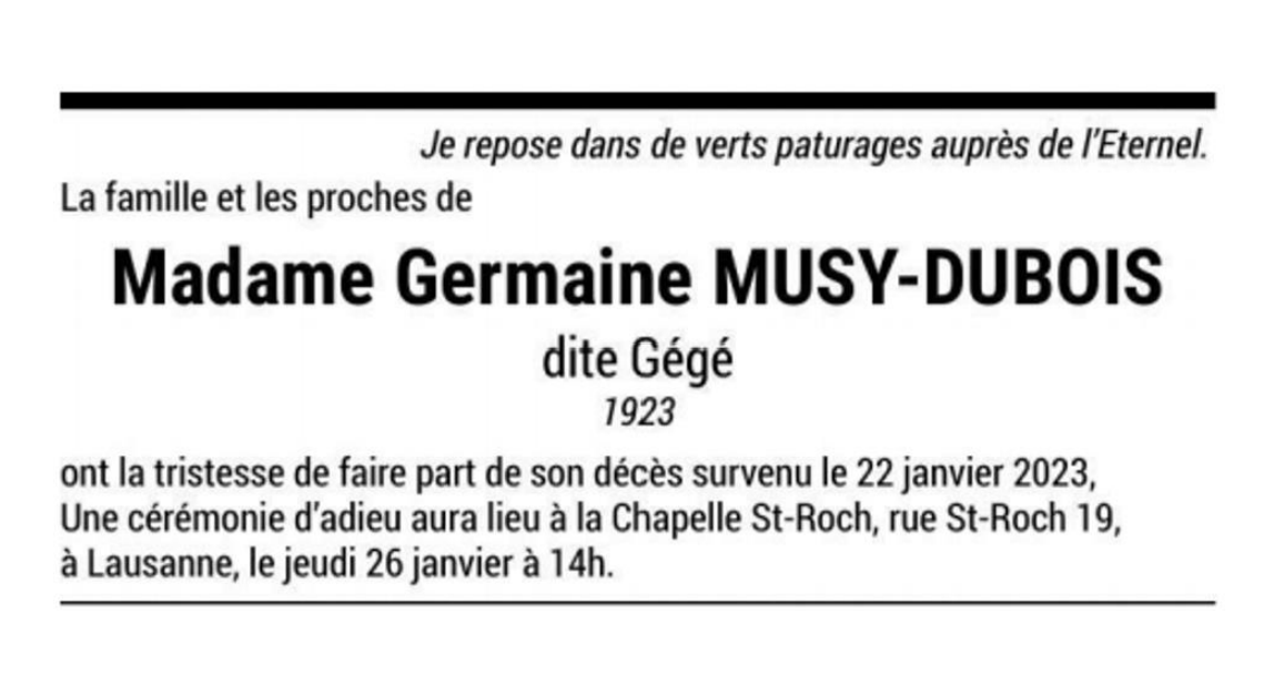 Madame Germaine MUSY-DUBOIS 25 juin. 1923 - 22 jan. 2023 Avis mortuaire PFG Télecharger PDF Partager sur: Galerie PreviousNext PreviousNext
