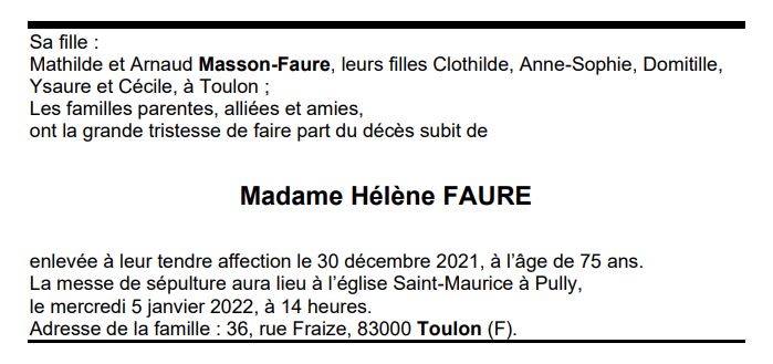 Madame Hélène FAURE 27 mai. 1946 - 31 déc. 2021 Avis mortuaire PFG Télecharger PDF Partager sur: Galerie PreviousNext PreviousNext