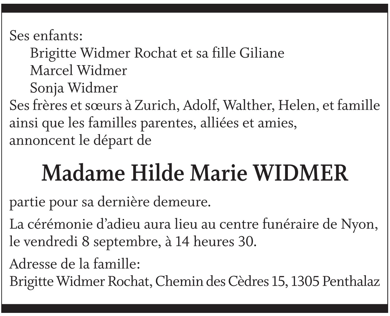 Madame Hilde Marie WIDMER 22 mar. 1935 - 03 sep. 2023 Avis mortuaire PFG Télecharger PDF Partager sur: Galerie PreviousNext PreviousNext