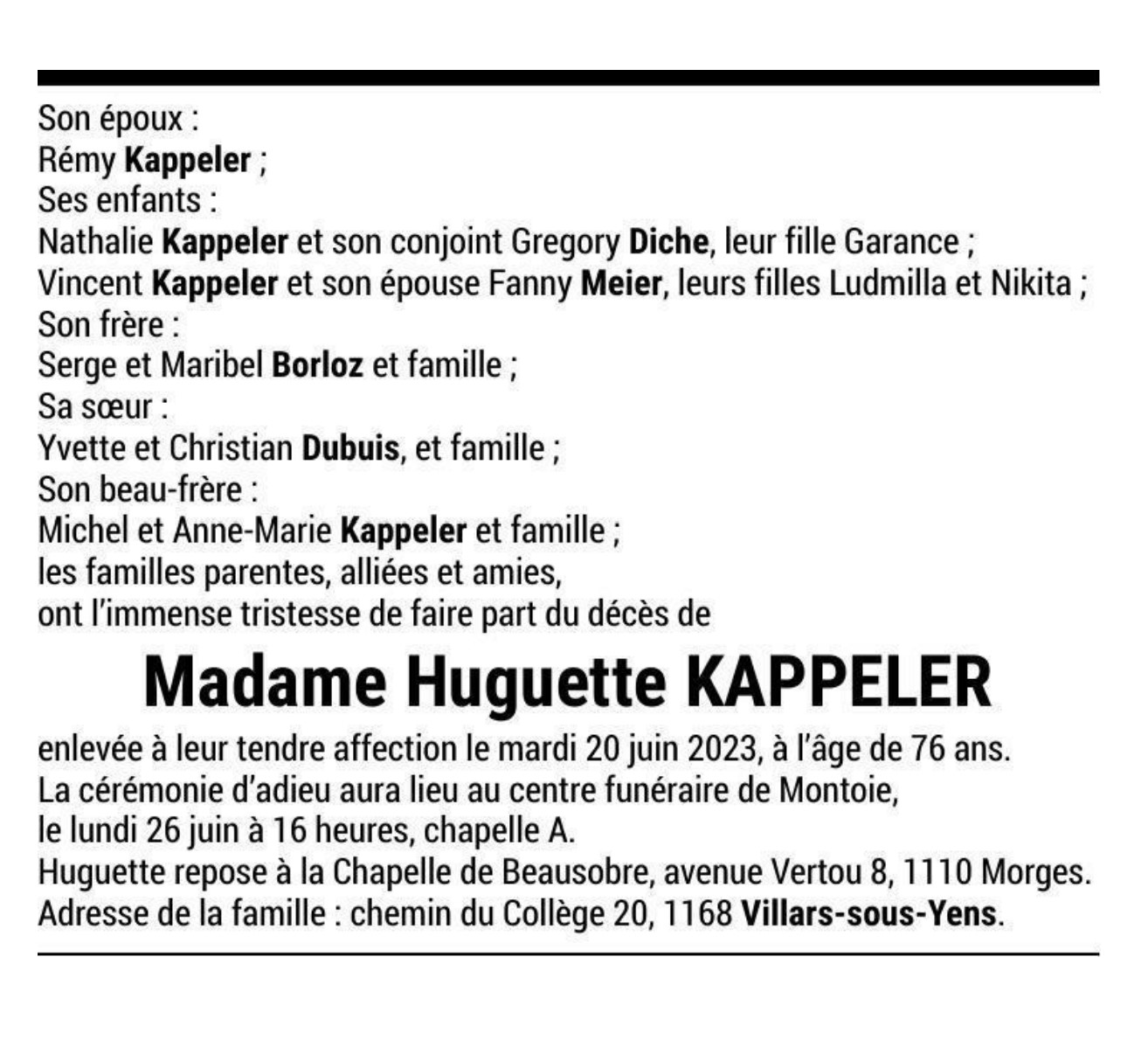 Madame Huguette KAPPELER 03 fév. 1930 - 20 juin. 2023 Avis mortuaire PFG Télecharger PDF Partager sur: Galerie PreviousNext PreviousNext