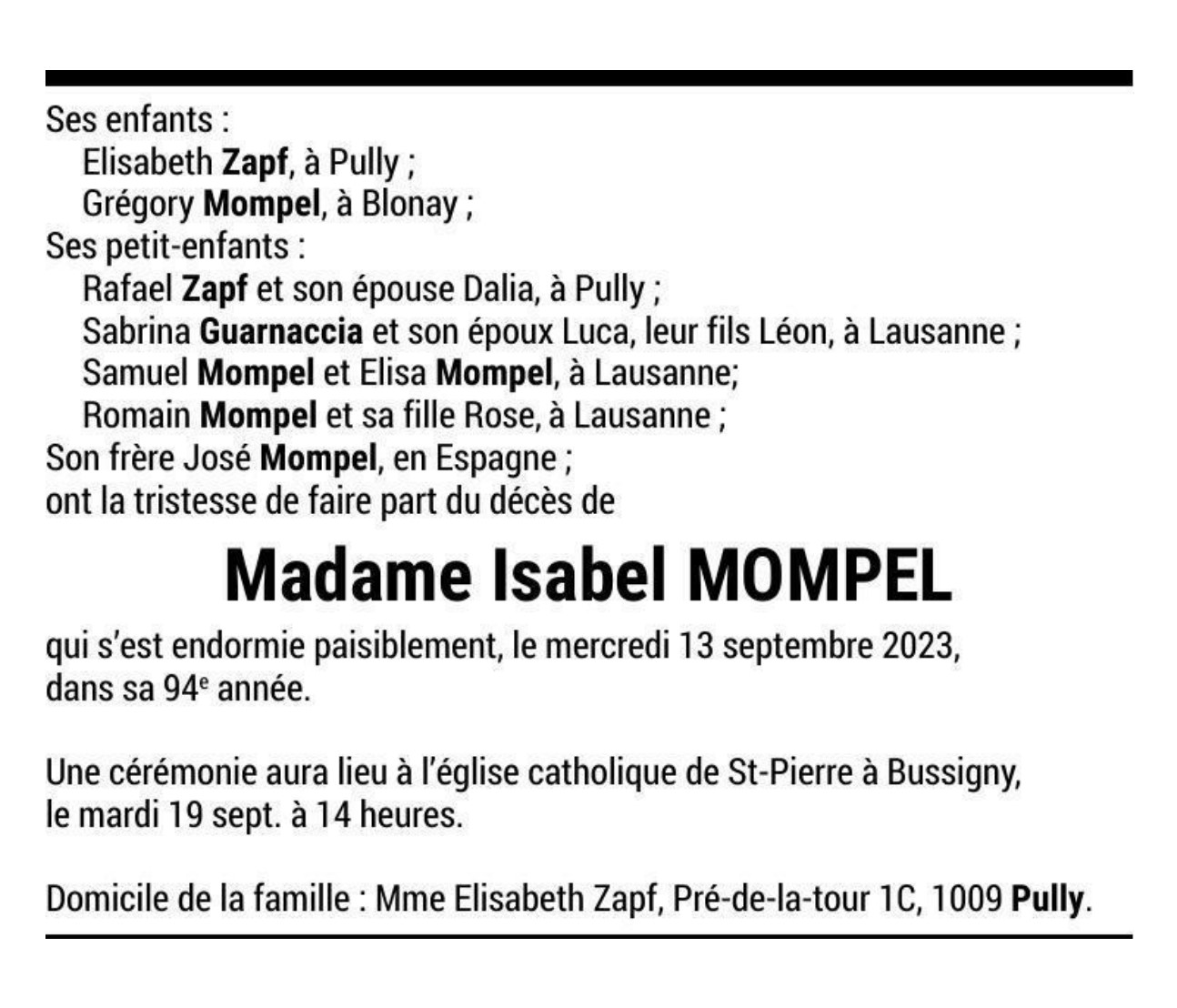 Madame Isabel MOMPEL 04 nov. 1929 - 13 sep. 2023 Avis mortuaire PFG Télecharger PDF Partager sur: Galerie PreviousNext PreviousNext