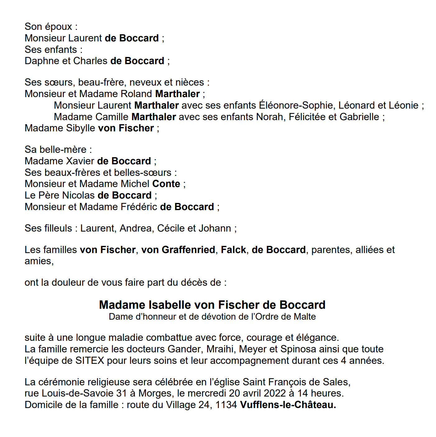 Madame Isabelle von Fischer de Boccard Avis mortuaire PFG Télecharger PDF Partager sur: Galerie PreviousNext PreviousNext