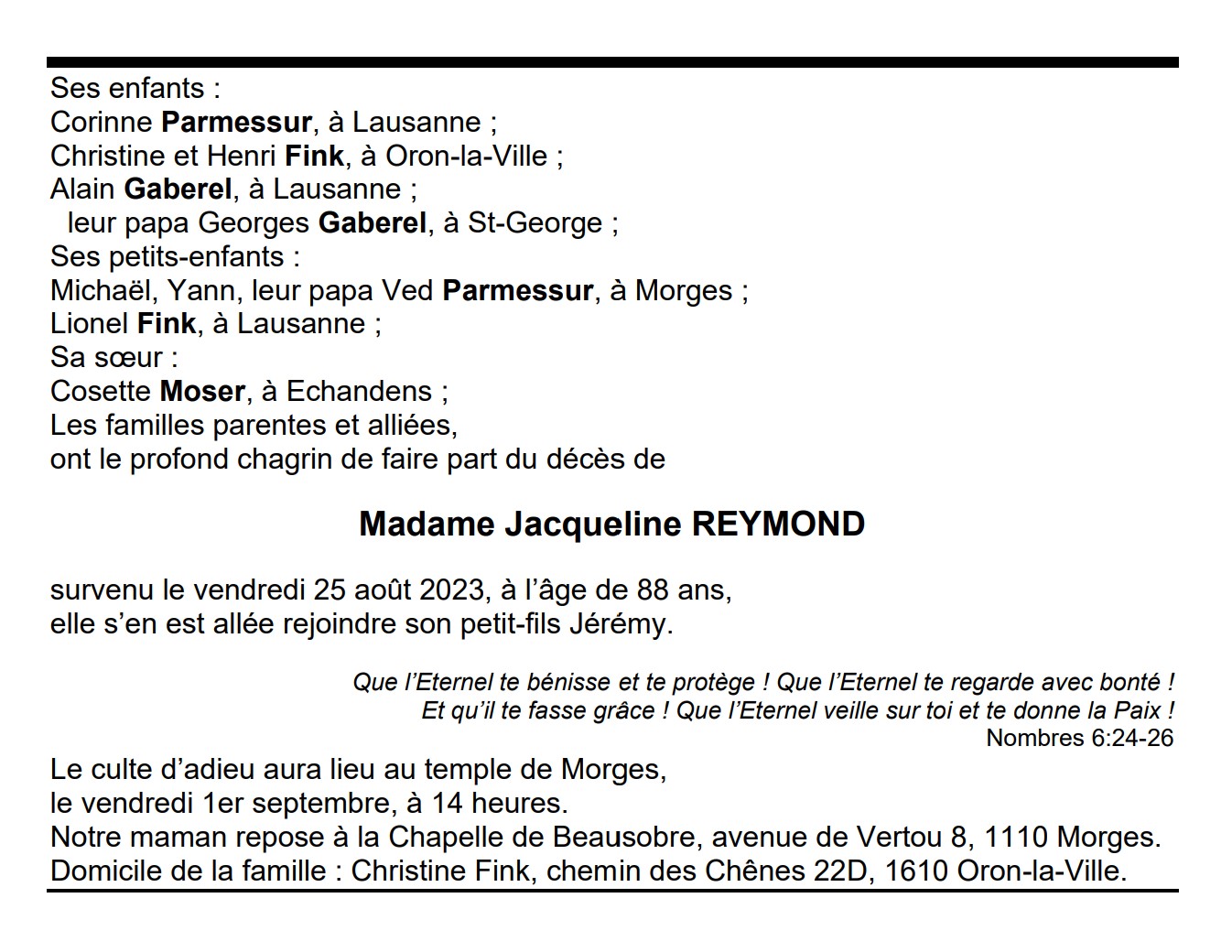 Madame Jacqueline REYMOND 01 mai. 1935 - 25 aoû. 2023 Avis mortuaire PFG Télecharger PDF Partager sur: Galerie PreviousNext PreviousNext