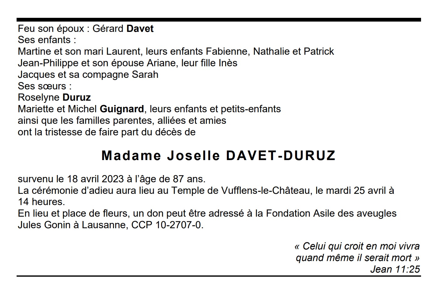 Madame Joselle DAVET-DURUZ 23 mar. 1936 - 18 avr. 2023 Avis mortuaire PFG Télecharger PDF Partager sur: Galerie